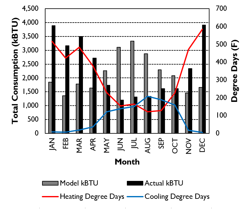 The building sector nowadays relies heavily on energy modeling practices to inform design and construction of buildings. These models and their findings are also used to upgrade outdated building codes and guidelines, and push toward a more sustainable future for the built environment. This summer I worked with the Beyond Efficiency team to develop a workflow for analyzing the energy performance of our past clients. You may have heard the famous quote “Essentially, all models are wrong, but some models are useful.” This is especially the case for building energy modeling, as energy usage is individual, and relies heavily on user behavior and preferences. We were not under the false presumption that our models were able to predict the actual energy consumption of buildings 100%. However, we were still interested in getting a sense of what we can do to improve the accuracy of our predictions in the future. For instance, the graph below compares the model outputs to one year of consumption data for one of our past clients.